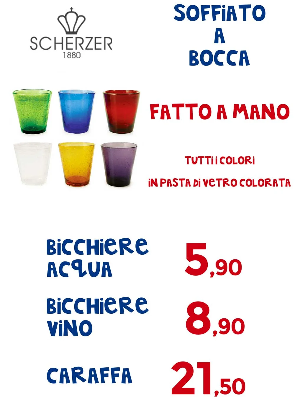 Cromoterapia a tavola con la linea Mediterraneo di Scherzer: bicchieri e caraffe in vetro fatto a mano, robusto ed adatto all'uso della lavastoviglie.